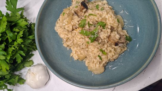 Add the garlic, herbs and rice, season with salt and pepper then cook for 1 minute until the rice is glossy