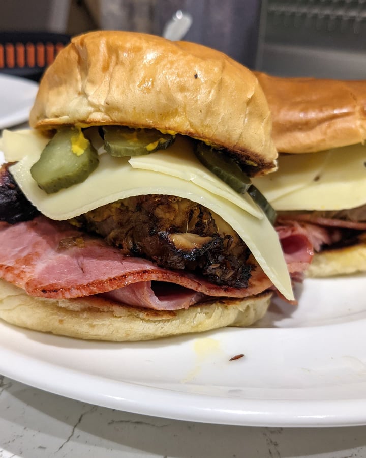 . Serves: 4 (with some pork leftover) Time: 3 hours (plus 14 hours marinating) 2.5 kg pork shoulder, scored after excess fat removed 950ml orange juice 150ml spiced rum 120ml rice vinegar 475 ml water 7 cloves garlic, crushed 2 tsp fresh sage, roughly chopped 2 tsp fresh oregano, roughly chopped 2 tsp fresh rosemary,Continue reading “Cubanos”